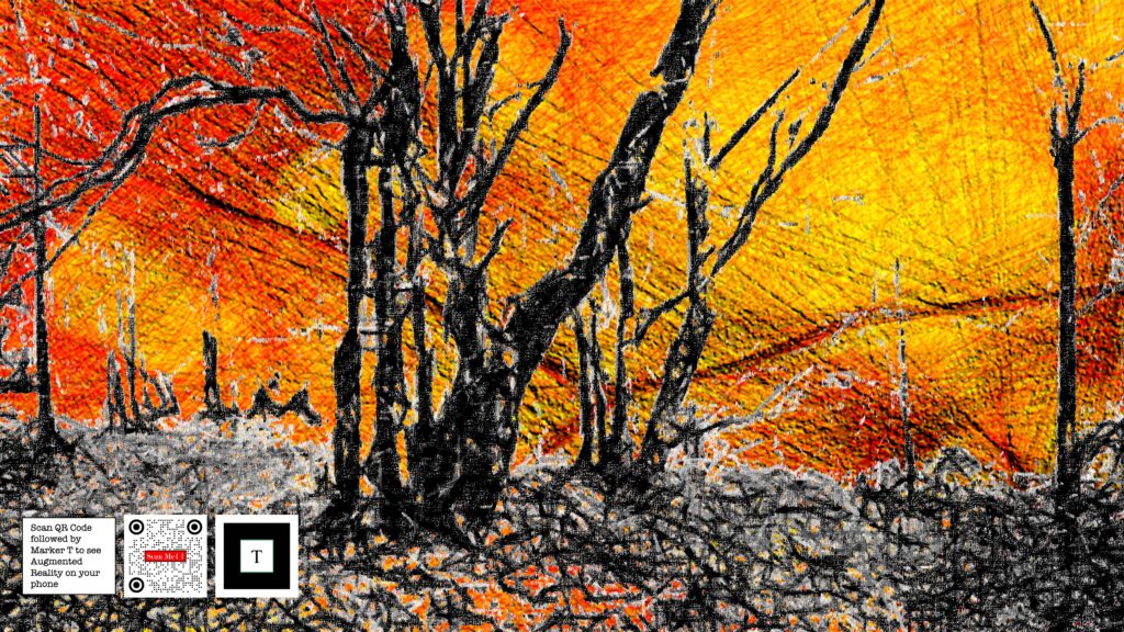Motion is provided by “extension” of the original artwork using QR Code on to the mobile phone. This artwork is Augmented Reality prepared. Just point the mobile phone camera at the QR code, followed by focusing it on Marker T to appreciate what digital arts could provide.